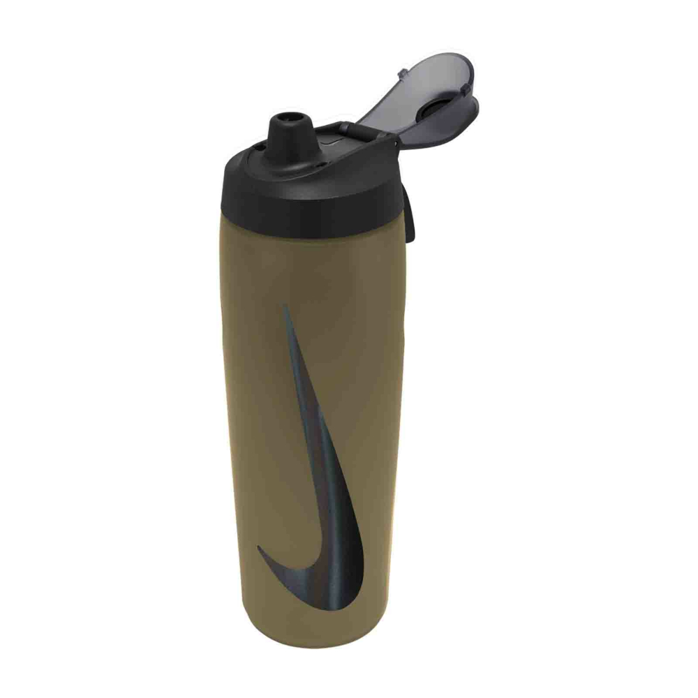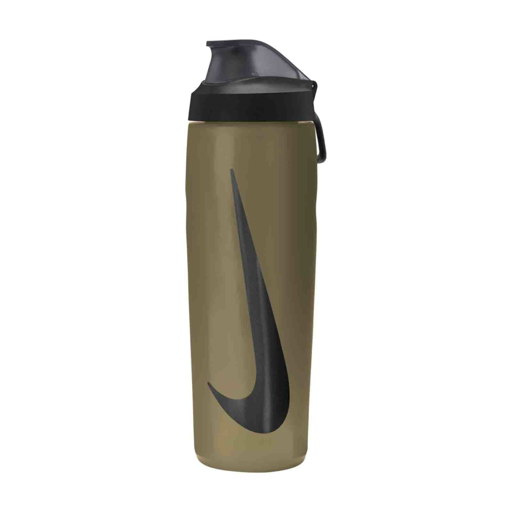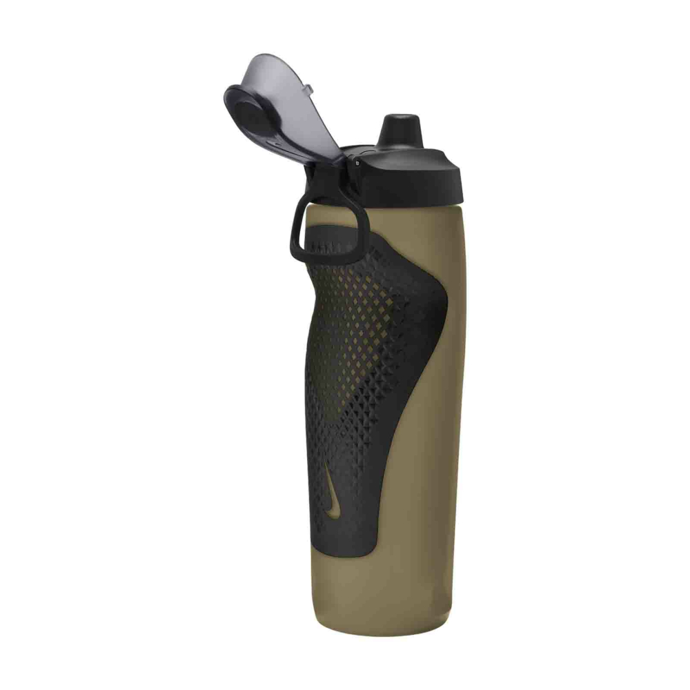 Keep hydrated on and off the court with this Nike Refuel Locking Lid Water Bottle. It holds 24 ounces and features a fast-flow, leak proof valve and a squeezable material. The handle is foldable for easy storage and carrying. A strategically placed overlay adds comfort and grip to the bottle.